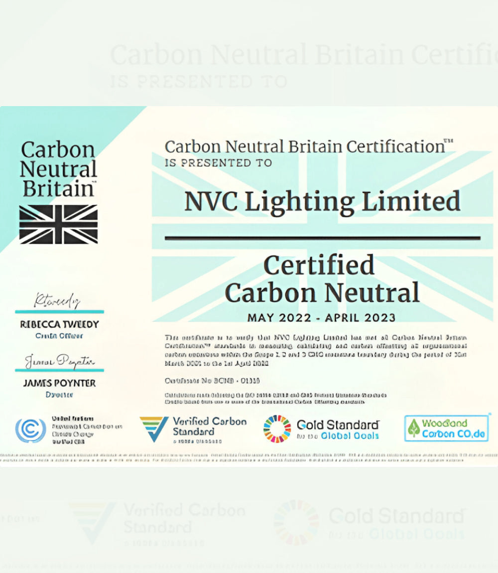The UK has committed to being carbon neutral by 2050. As a responsible member of the lighting industry, NVC is keen to play its part in this, so we have taken the necessary steps and can now announce that NVC Lighting Limited is Carbon Neutral